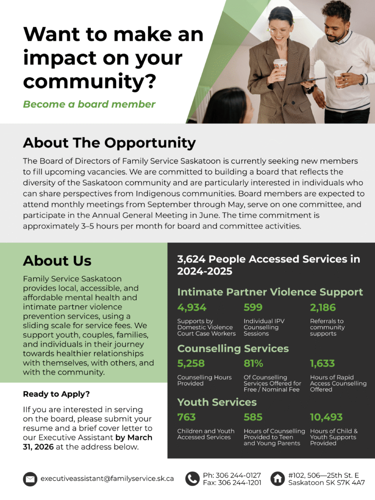 Family Service Saskatoon offers counselling services, family violence prevention and outreach, and therapeutic group sessions. We are person-centered and implement strengths-based, and solutions-focused approaches. We work from a trauma and violence-informed lens to offer a safe and supportive environment.